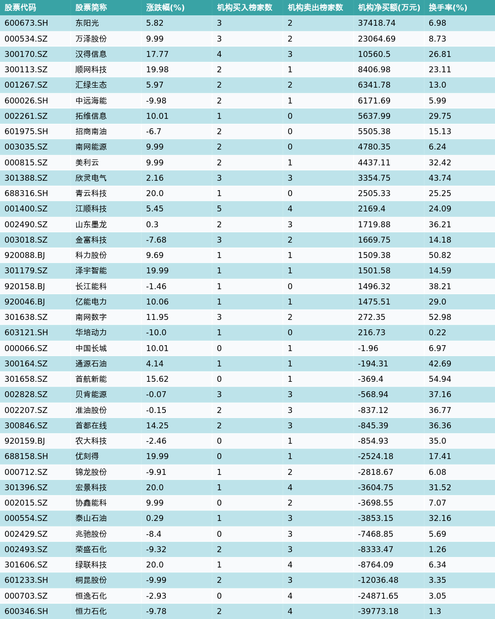 南财智讯3月9日电,盘后数据显示,因当日异动登上龙虎榜的个股中,39只沪深A股龙虎榜出现了机构的身影,机构合计净买入8797.12万元,具体来看,盛达优配机构净买入21只个股,净卖出18只个股。其中,机构净买入前三分别为东阳光(600673.SH)、万泽股份(000534.SZ)与汉得信息(300170.SZ),详情见下图:机构净卖出的个股中,前三分别为恒力石化(600346.SH)、恒逸石化(000703.SZ)与桐昆股份(601233.SH)。